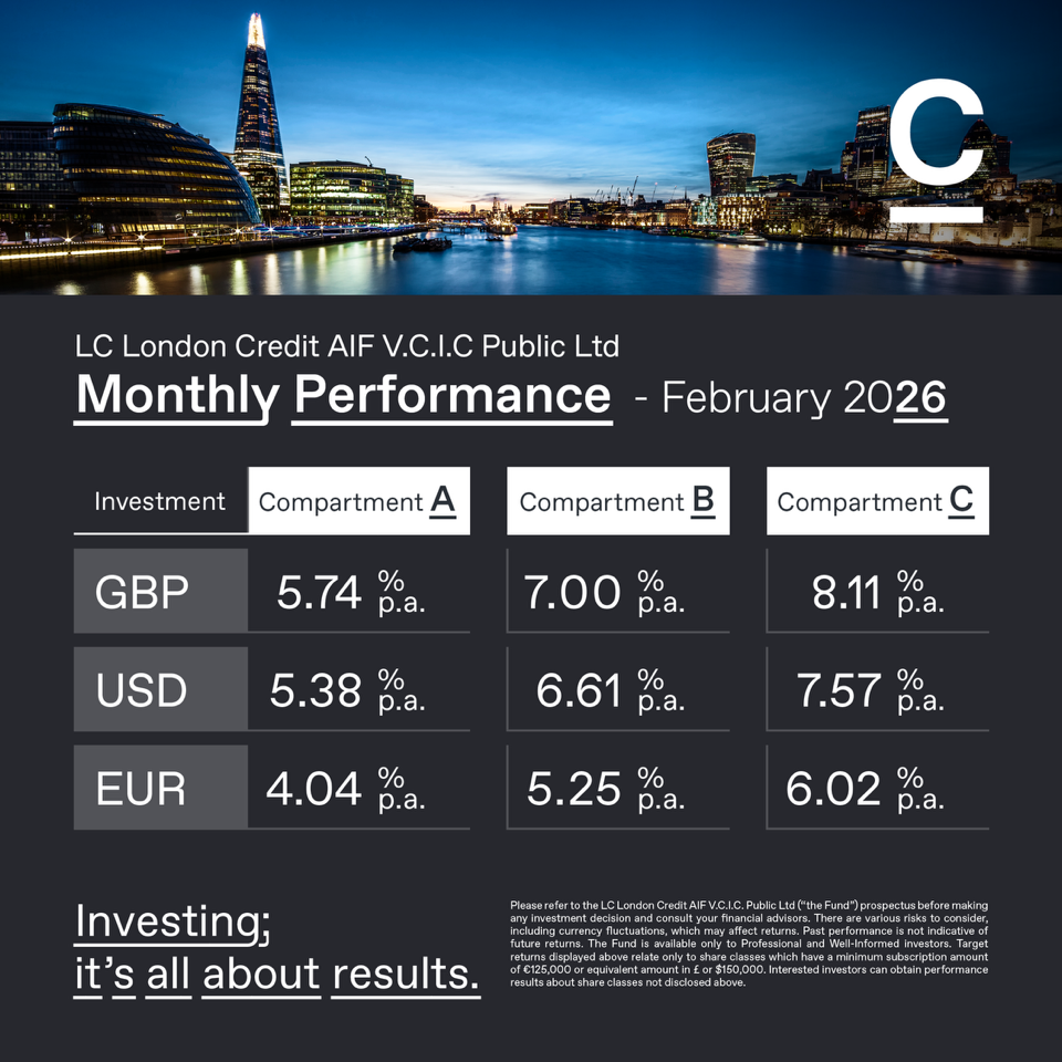 Disclaimer: Please refer to the LC London Credit AIF V.C.I.C. Public Ltd (“the Fund”) prospectus before making any investment decision and consult your financial advisors. There are various risks to consider, including currency fluctuations, which may affect returns. Past performance is not indicative of future returns. The Fund is available only to Professional and Well-Informed investors. Target returns displayed above relate only to share classes which have a minimum subscription amount of €125,000 or equivalent amount in £ or $150,000. Interested investors can obtain performance results about share classes not disclosed above.