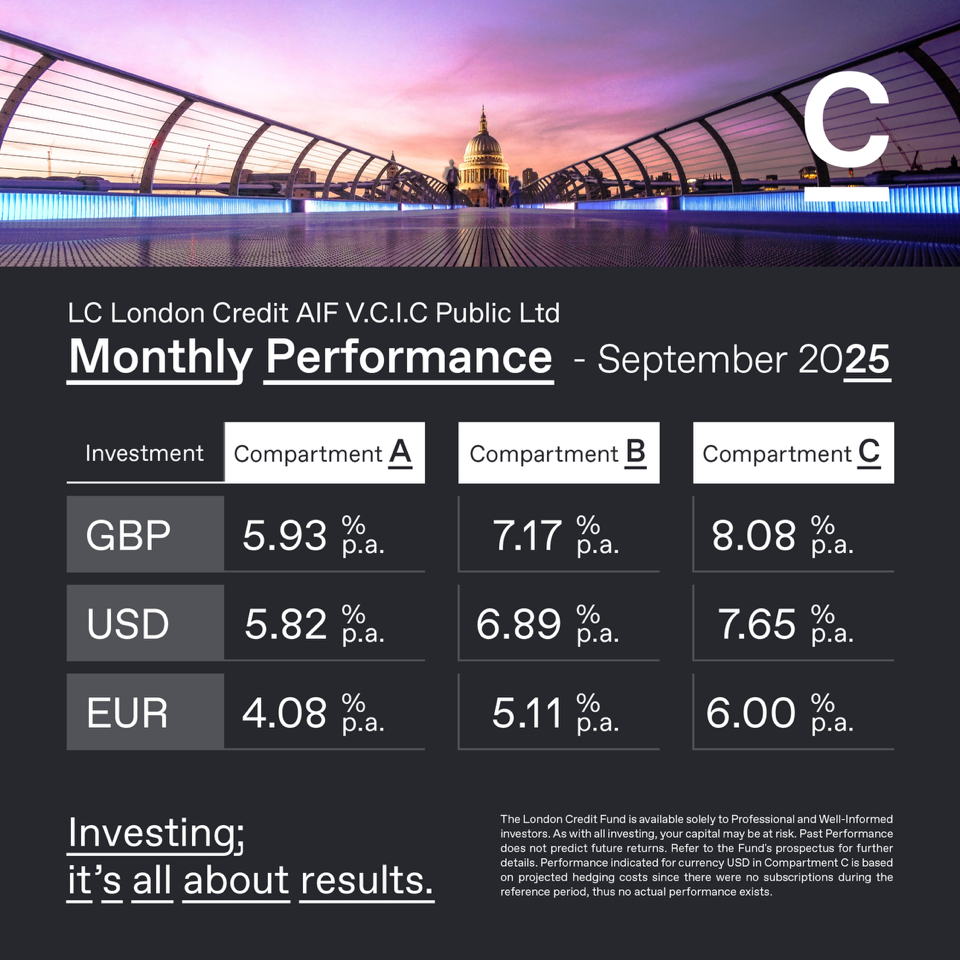 September 2025 was another strong period for the London Credit Fund, with all compartments delivering results in line with their annual targets. This consistent performance reflects the London Credit Fund’s disciplined lending approach, focused on short-term loans secured by high-quality UK real estate, and is clearly reflected in the returns achieved across all currencies this month.